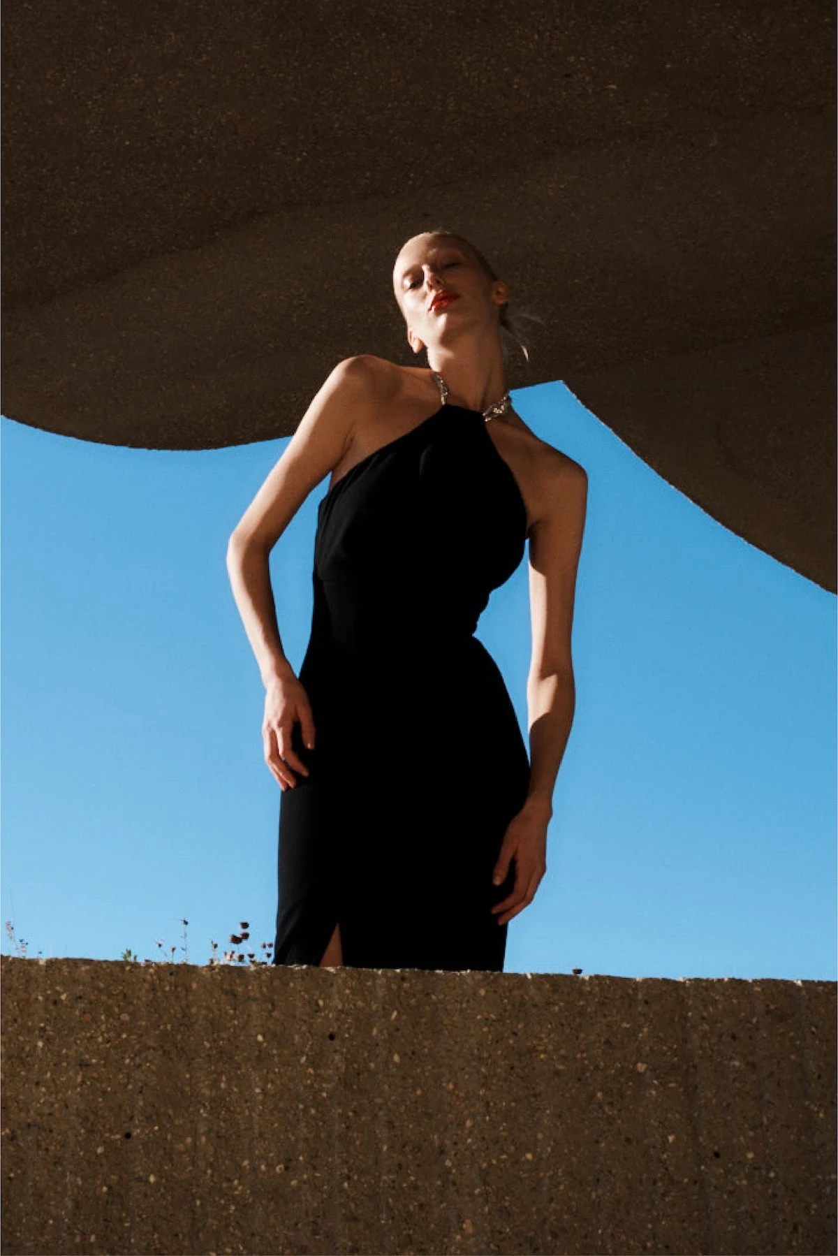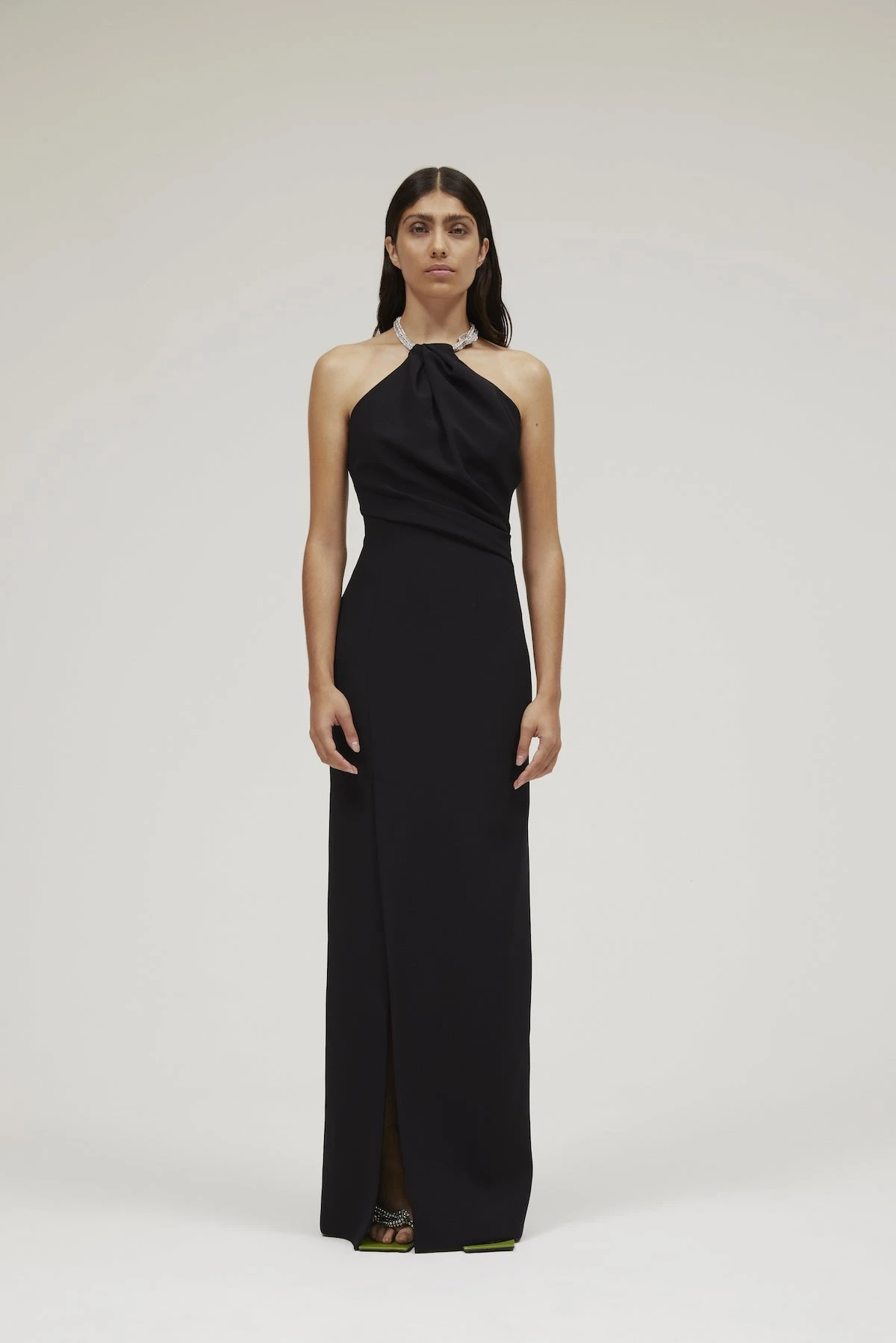 The Danette is a body-conscious floor length gown with a diamante neck piece and softly draped bodice.