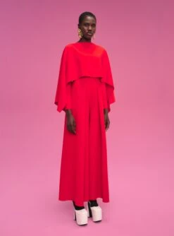 The Lara Jumpsuit features a wide pleated pant and draped modest bodice with long sleeves.