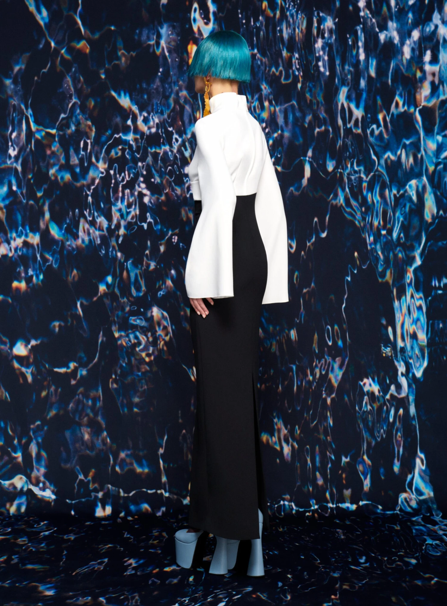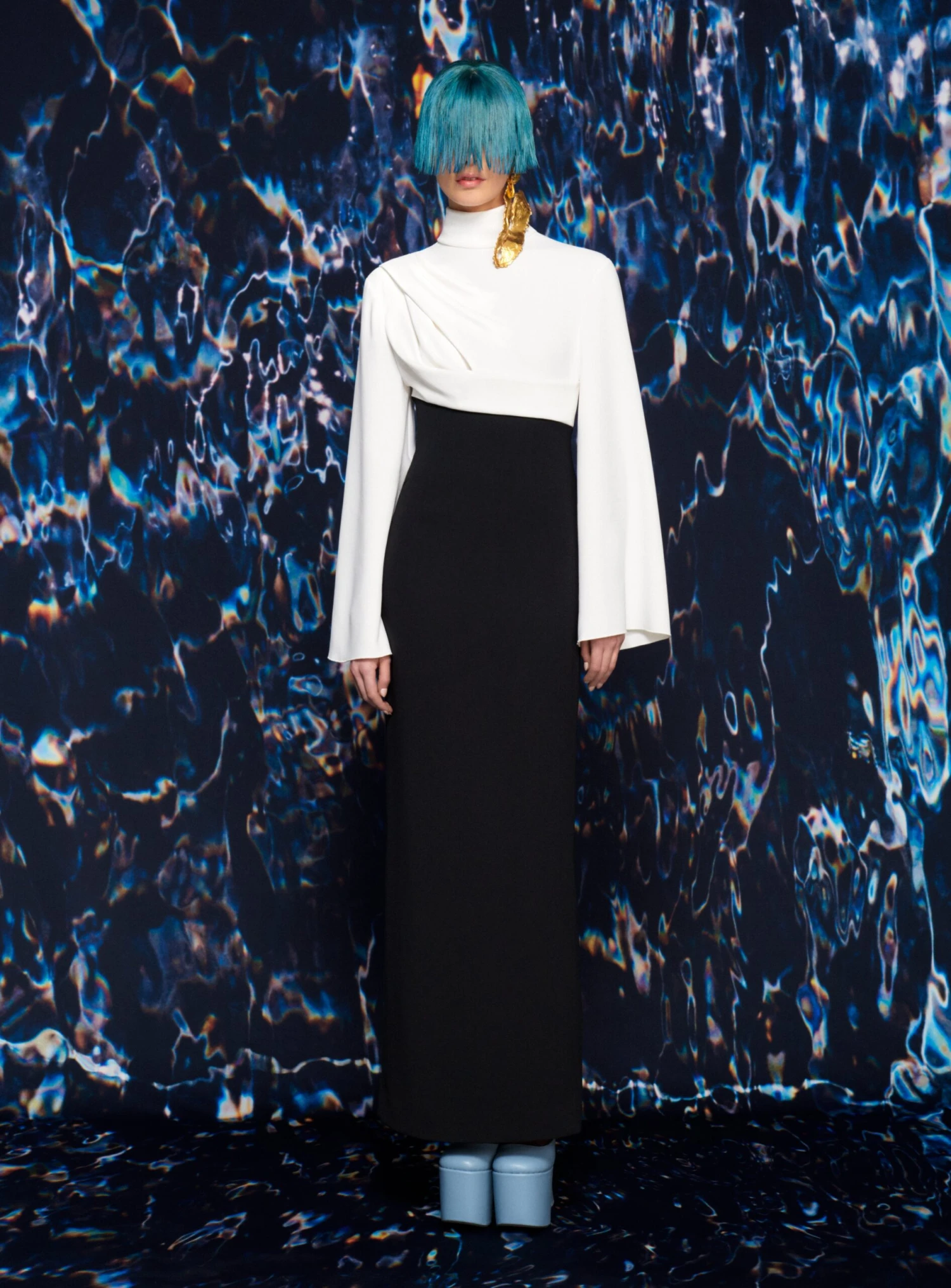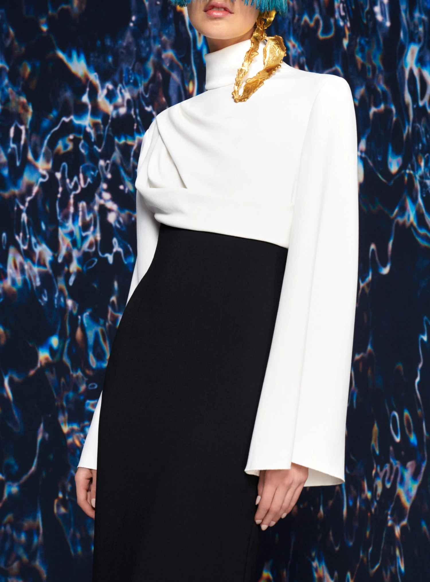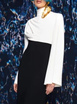 The Lia is a body skimming floor length gown featuring a contrast draped bodice and high-neck.