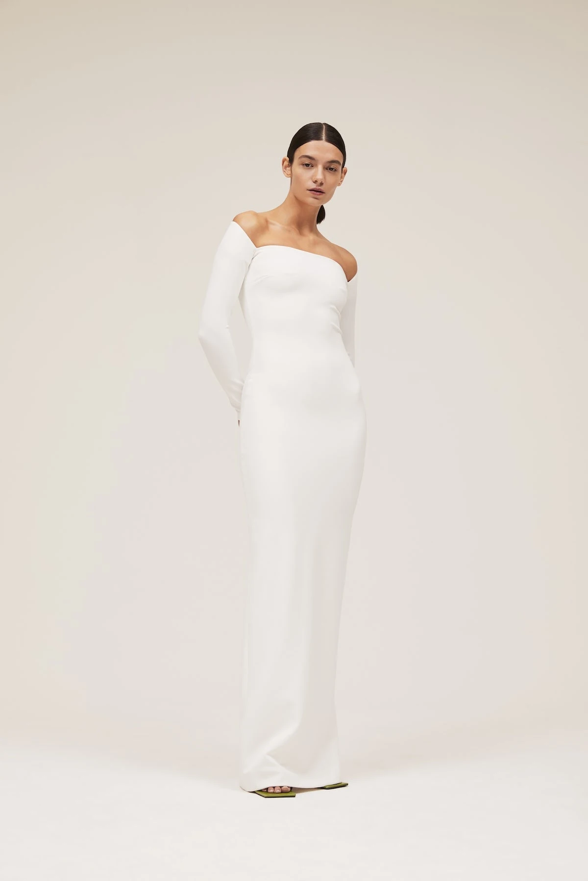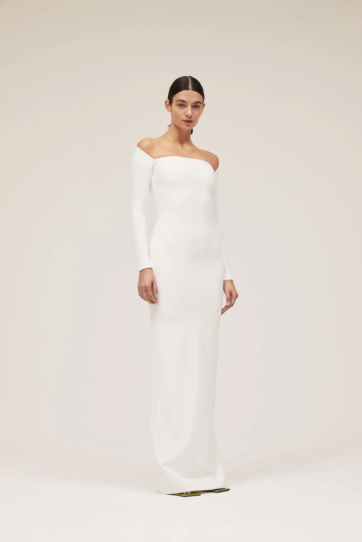 The Lolita is a floor length modern gown with an exaggerated square neckline.