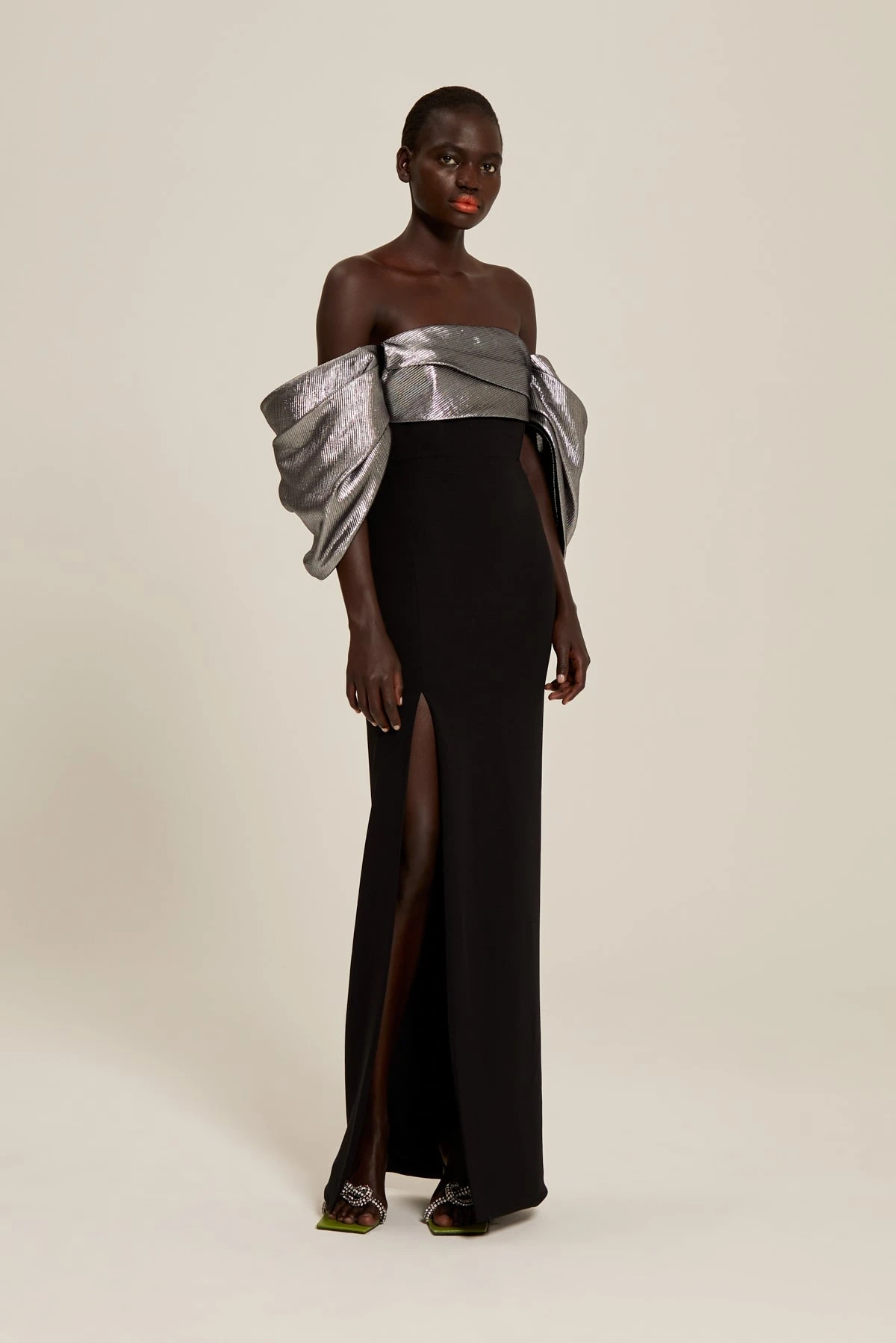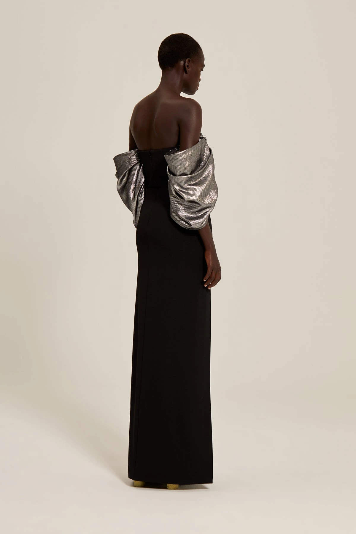 The Luna is a strapless floor length gown with dramatic sculptural sleeve detail.