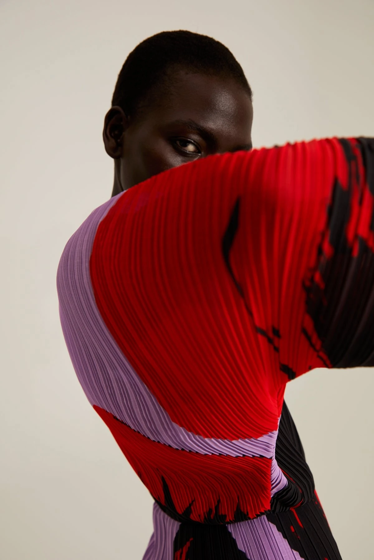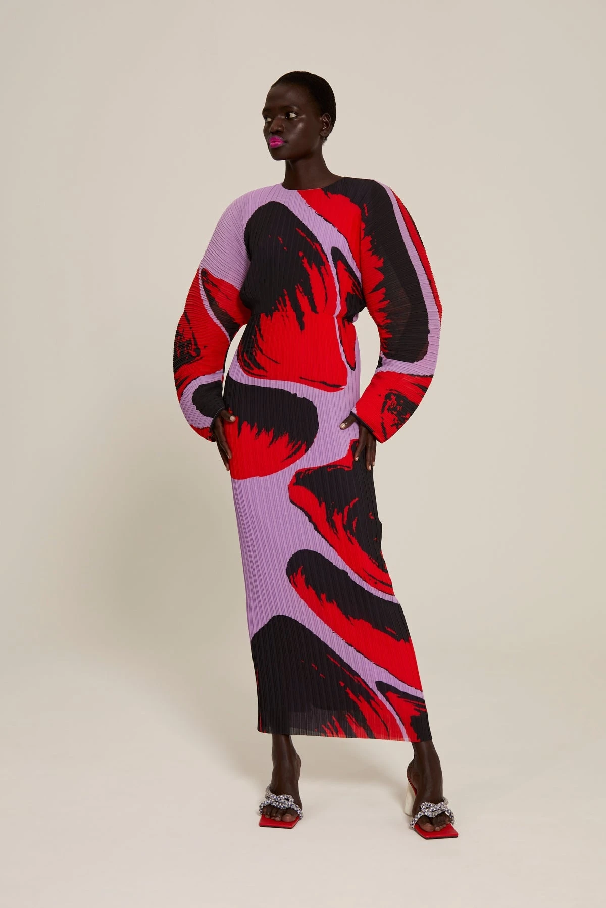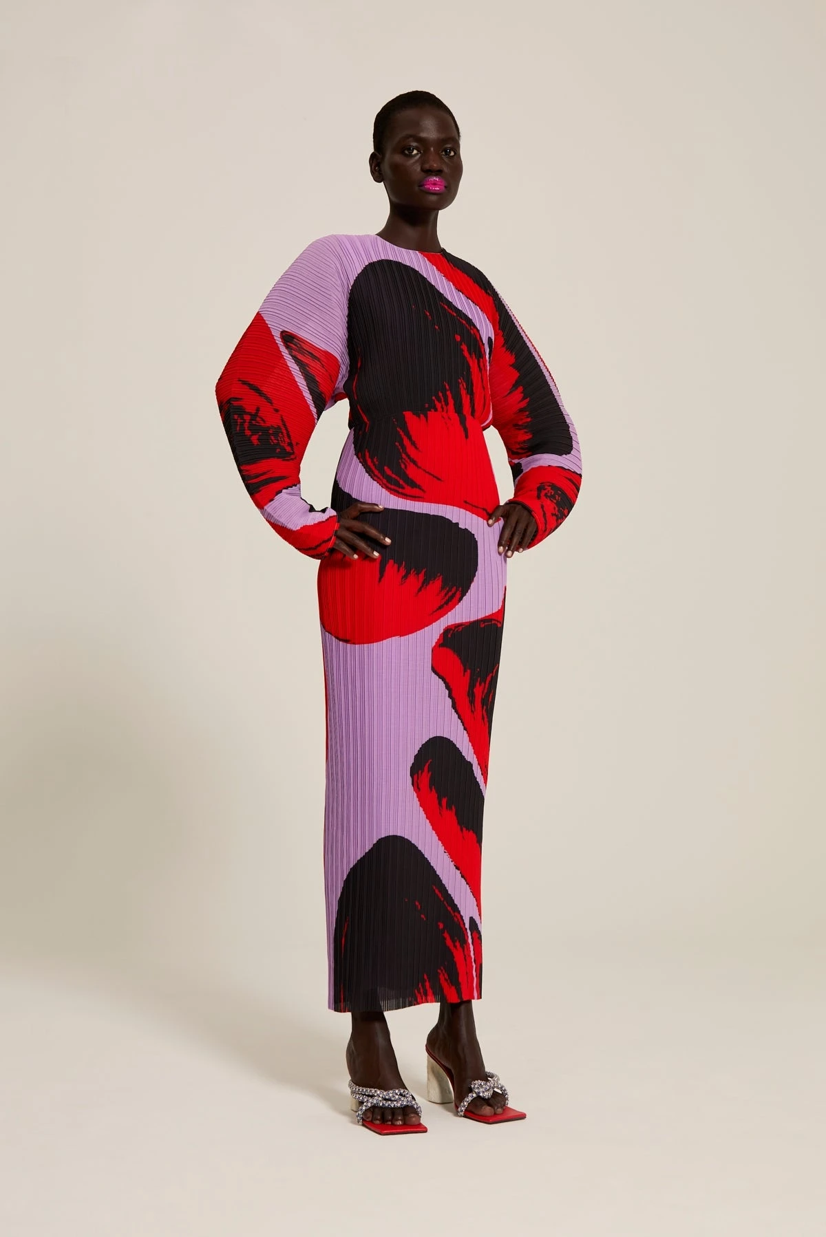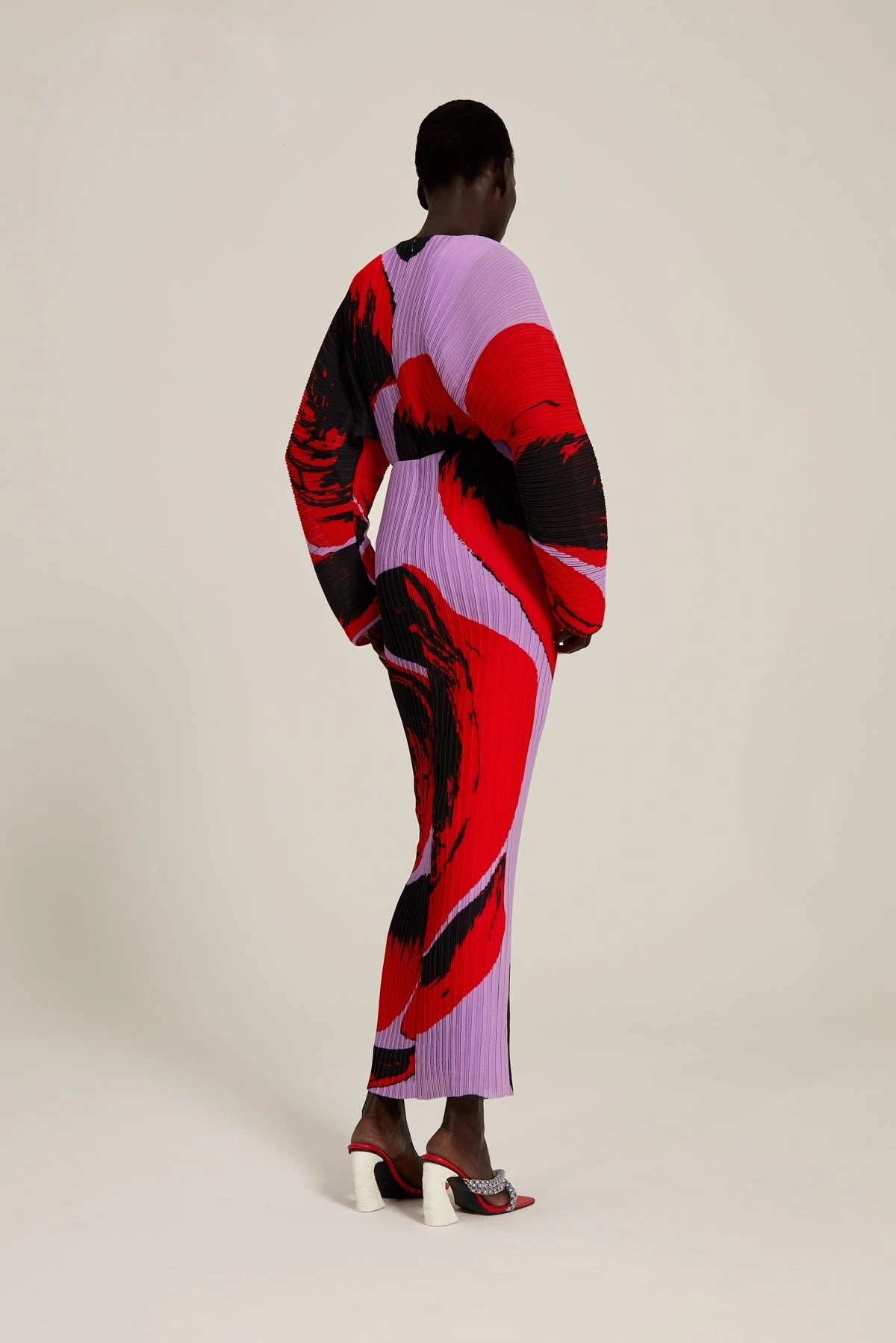 The Mirabelle is a midi length dress in signature irregular box pleat reimagined with exaggerated cocoon sleeves.