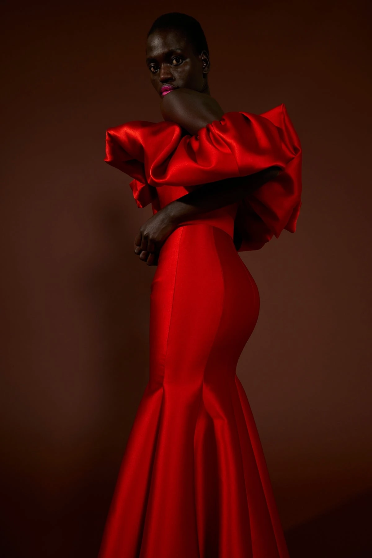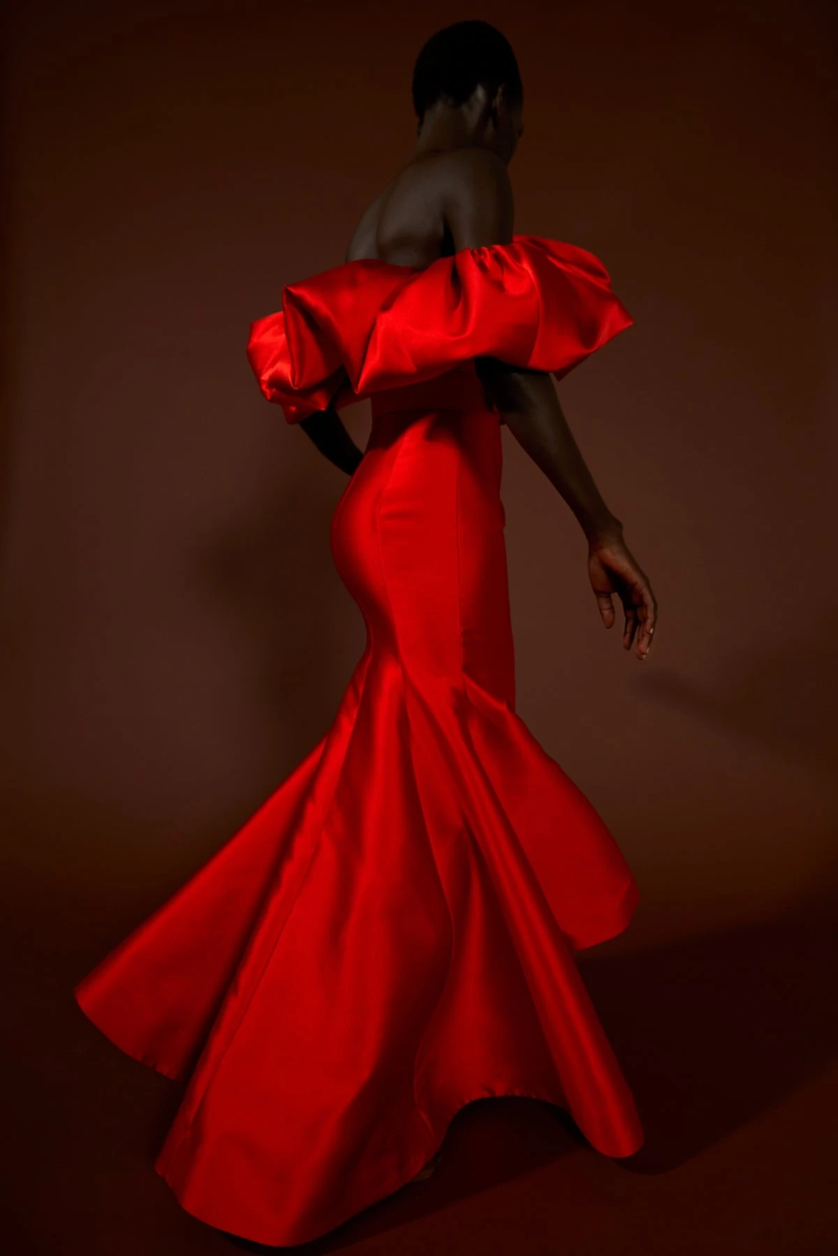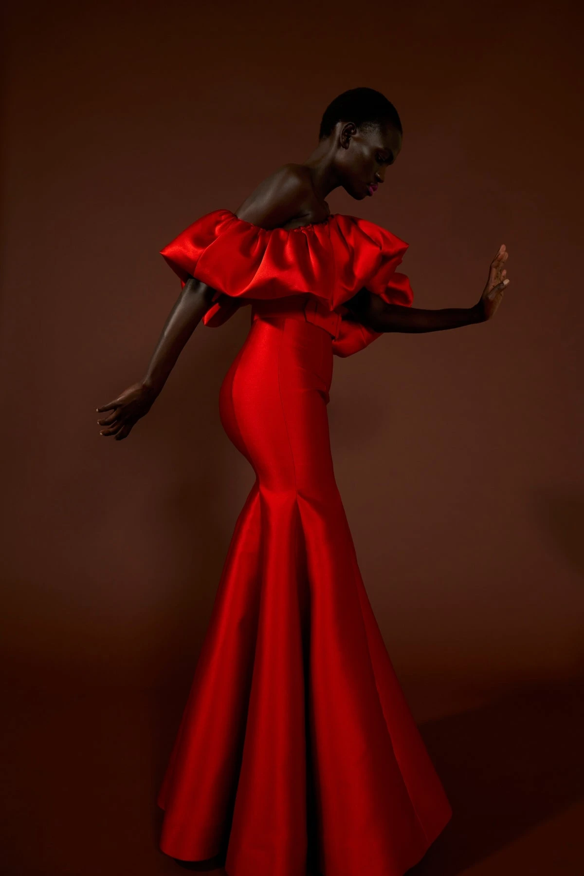 The Pyper is an off the shoulder corseted gown featuring a dramatic ruffle overlay and full flared skirt.