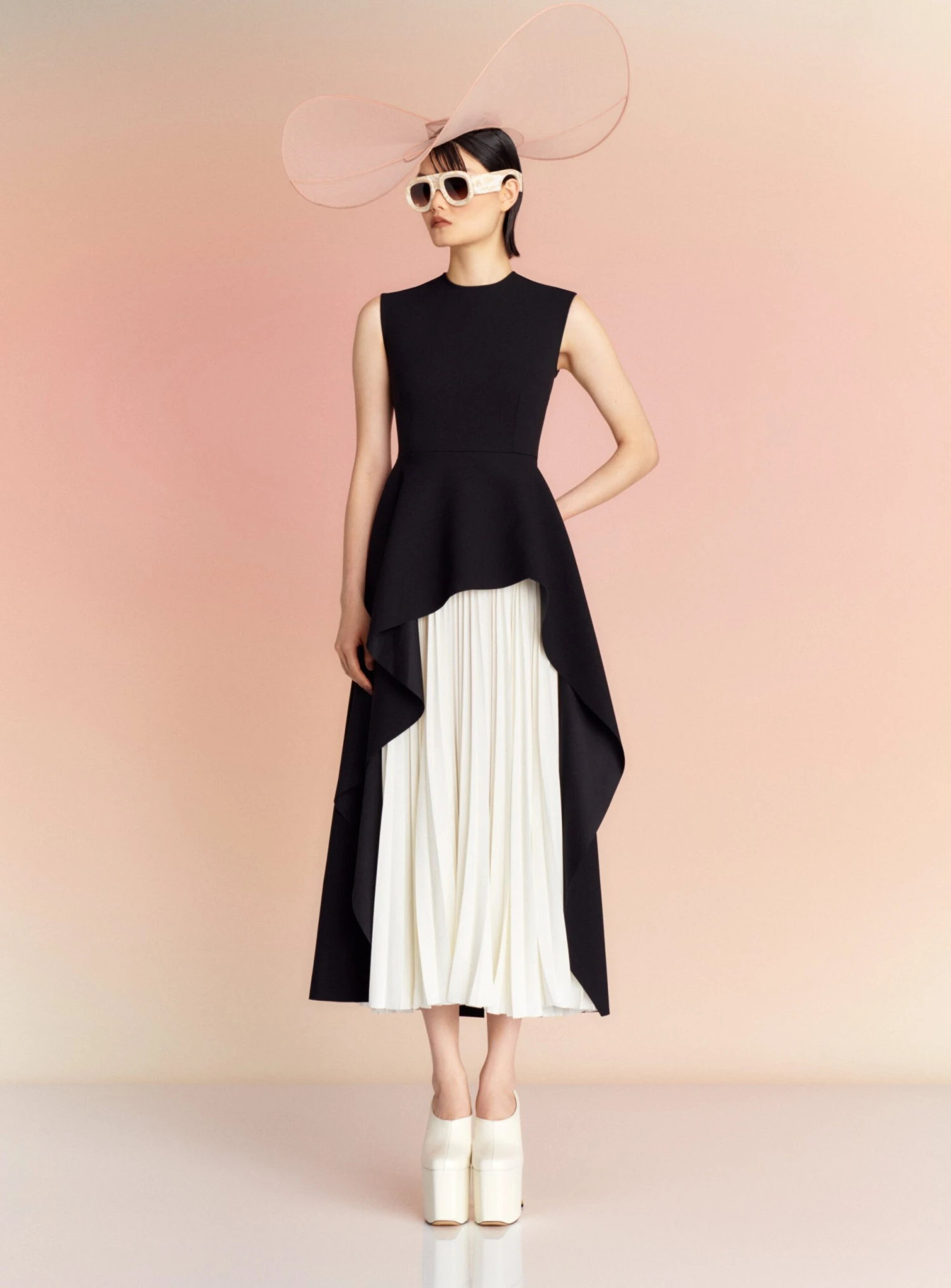 The Severny is a modern cocktail style featuring a draped asymmetric peplum and contrasting sunray pleated skirt.