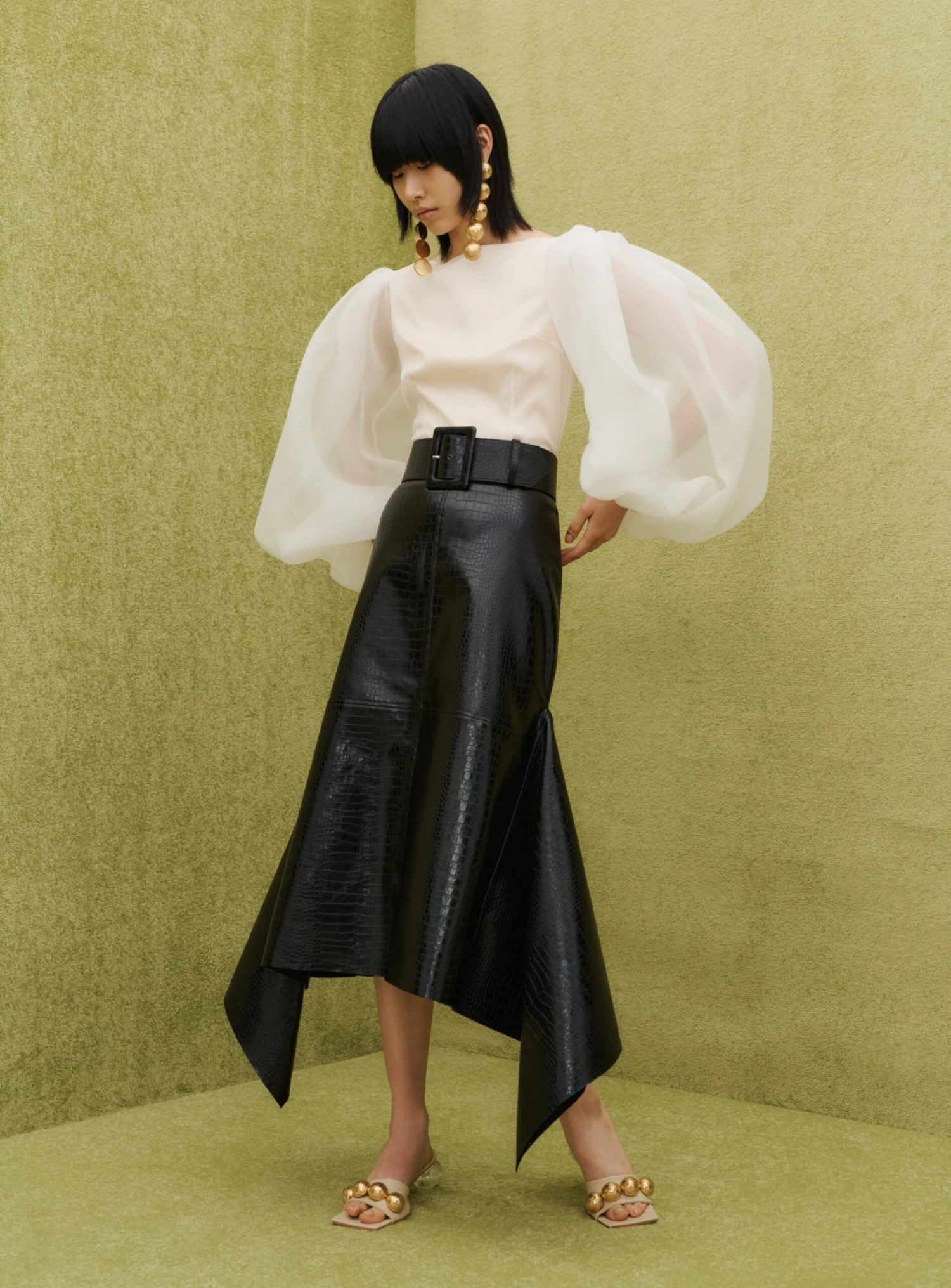 The Sienna is a dramatic style featuring voluminous double layer organza sleeves.