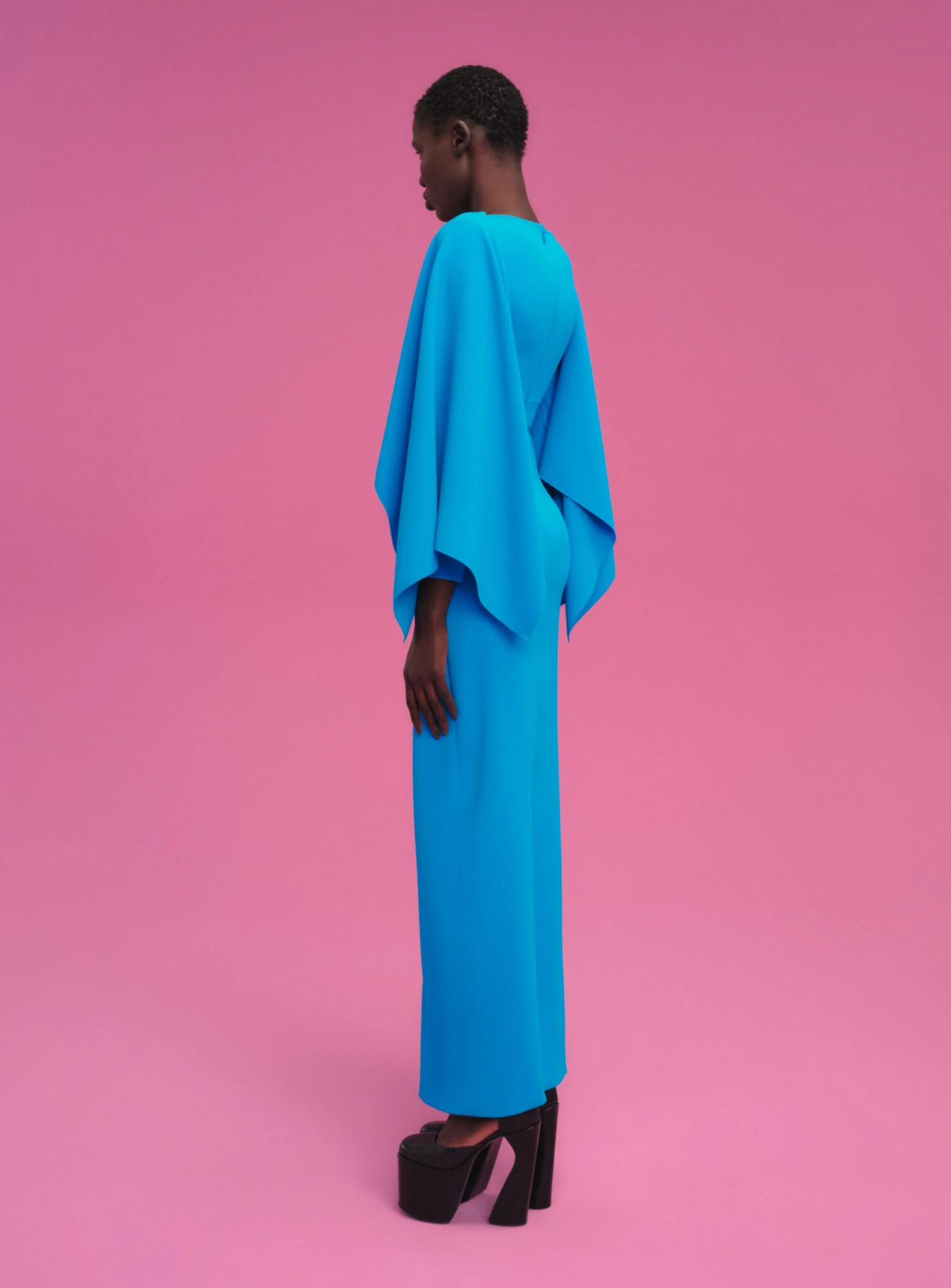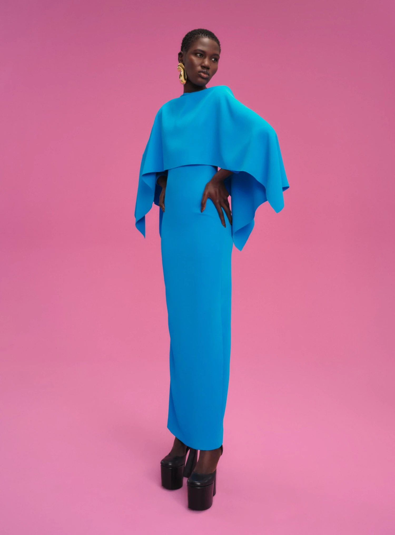 The Yael is a modest maxi dress featuring a draped bodice with cape and a full length column skirt.