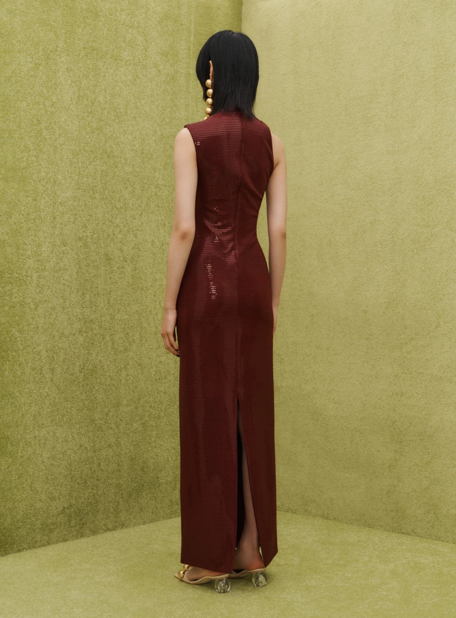 The Yara is a modern sequinned body conscious gown with a graphic shoulder cut out and high neck.